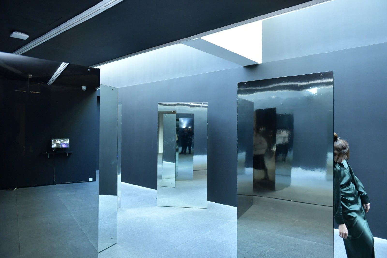 在OCAT研究中心展廳最明亮而寬闊的長走廊上,紙老虎工作室借助六個鏡面反射的三棱柱營造了一個劇場式的空間,邀請觀眾進(jìn)入并參與到劇目的演繹與發(fā)展中來。鏡面反射著“我”和周圍的環(huán)境,清晰地呈現(xiàn)著“我”在環(huán)境中的位置。