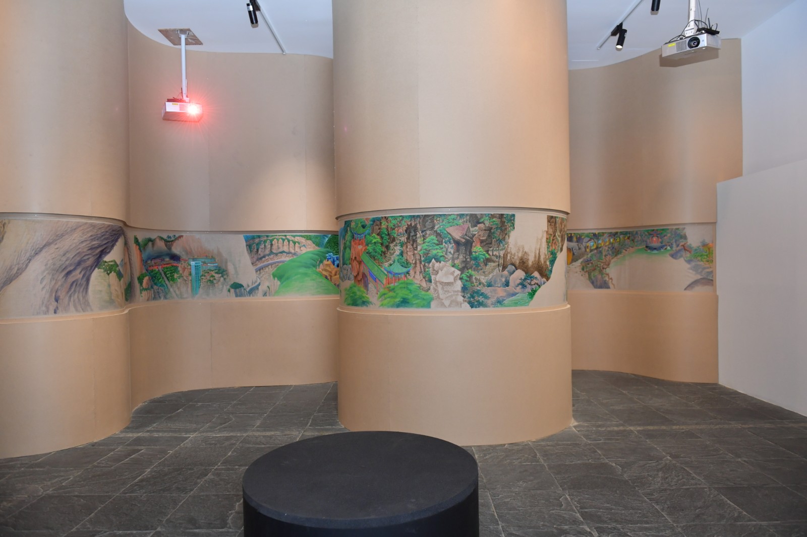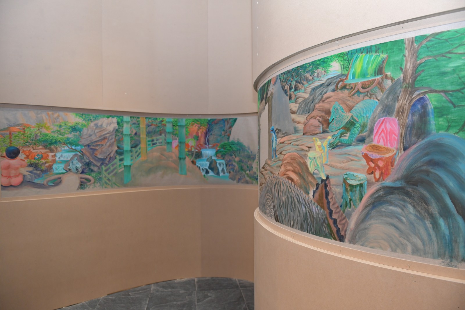 “地洞”一旁是展廳的下沉區(qū)域,這里被策展人設(shè)計為去往“桃花源”的實體路徑。梁碩的《景了個區(qū)》出現(xiàn)在這個下沉空間的一排四個口袋式的連續(xù)隔間墻面上,從空間上來說是無比契合的。回顧梁碩2019年在北京公社的展覽《梁碩:景區(qū)》同樣可以見到這樣一種迂回的觀展路徑?!熬皡^(qū)”這個概念的提出,在藝術(shù)家看來代表著今天人們對山水的理解,這個獨(dú)特的概念跨越了自然景觀與都市空間。梁碩在自己撰文的《景了個區(qū)》中復(fù)原了一個景區(qū)籌備建立起來的小故事,承包景區(qū)改造的劉工在工期接近尾聲時,看到自己的“杰作”時不由感嘆:“這些水泥造物,居然都妥妥的在那了,像是本來就是從山里長出來的,那巨大的假山石和假樹根顯得造型怪異,卻頗得陳老蓮氣韻,在落日的余暉中與真山融為一體,真山也像了假山……”[6]景區(qū)的建立勢必意味著人工、商業(yè)、消費(fèi)對自然景觀的直接侵入與改造,空間、審美、意識形態(tài)等一系列問題由此發(fā)生。