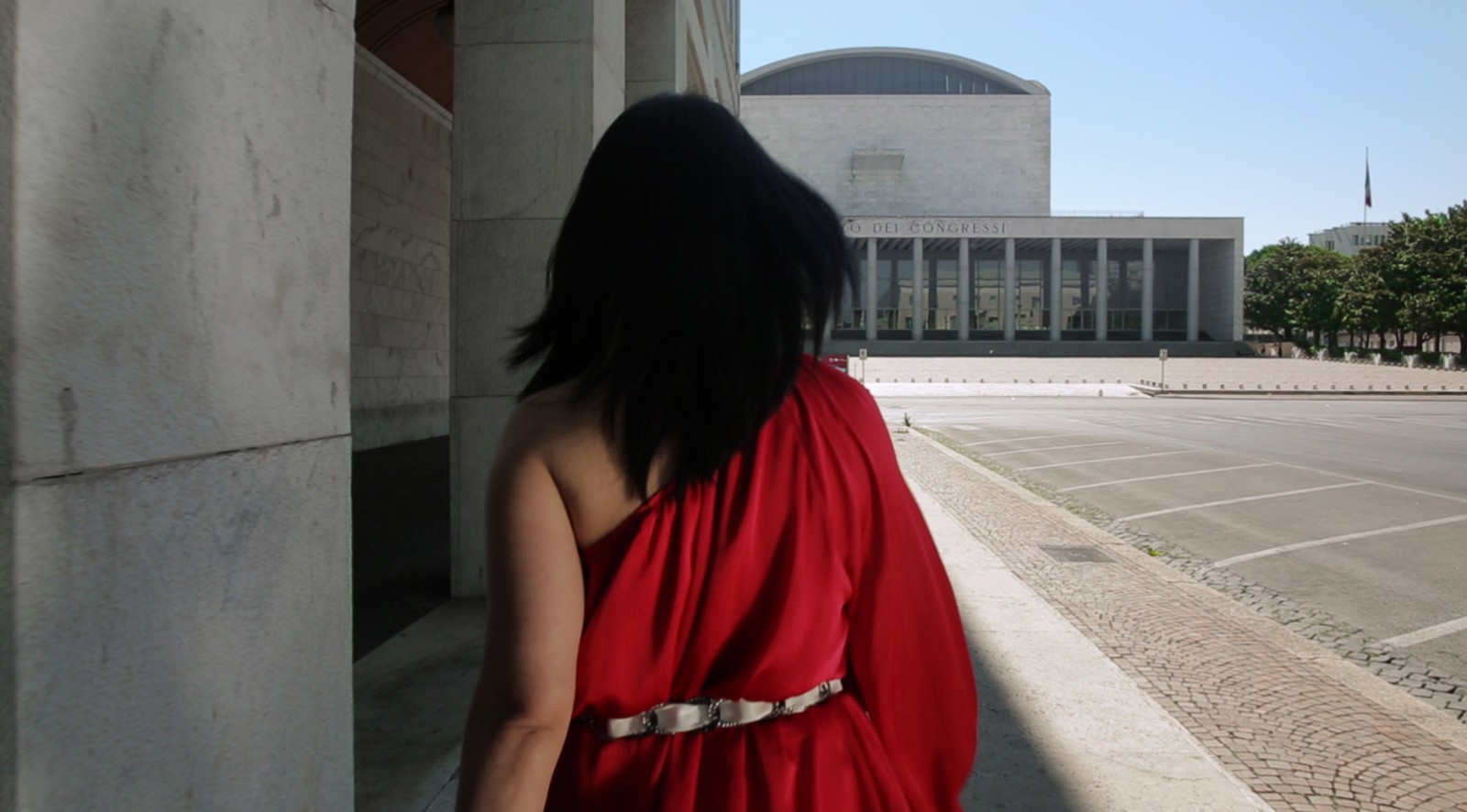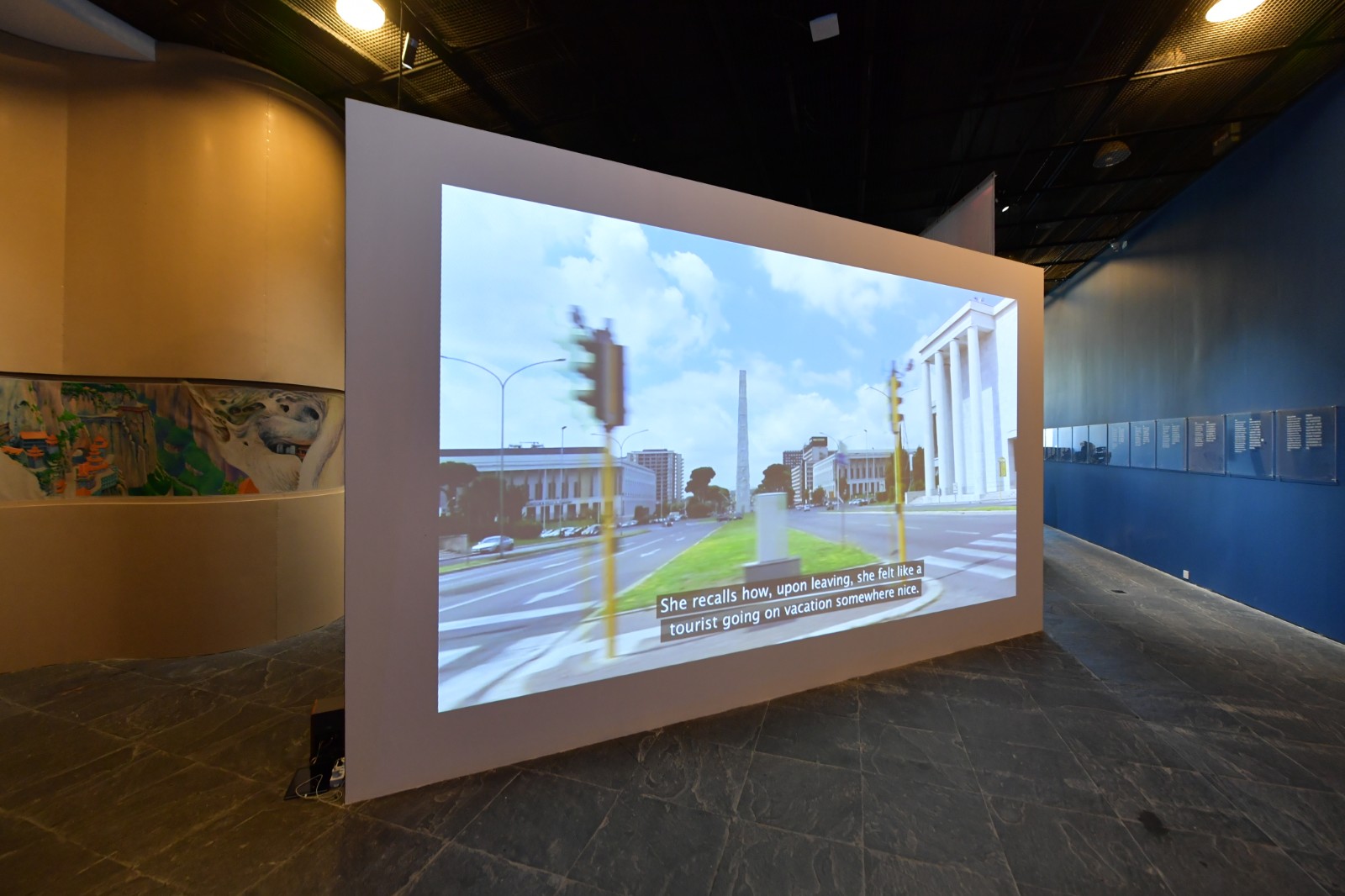 梅·海瑟格(Maj Hasager)《我們將在盲點(diǎn)相遇》是展覽呈現(xiàn)的最后一件作品,其講述了關(guān)于羅馬新城EUR區(qū)(Esposizione Universale di Roma)里的菲律賓移民的故事。這座由墨索里尼親自監(jiān)督設(shè)計的,以法西斯美學(xué)構(gòu)想出來的烏托邦城市,直至1960年才建成并被逐步被開發(fā)為羅馬新的富人區(qū)。海瑟格把眾多意大利導(dǎo)演在EUR區(qū)攝制的紀(jì)錄片、電影所刻畫的城市公共記憶,與這群定期在市中心一座教堂的地下室聚會的移民社群一同放入她的影像作品中,影像記錄了這個群體的閑暇時光,以一種個人的、私密的視角探索了菲律賓移民的私人記憶與生活如何融入并生存于這座有著強(qiáng)大歷史記憶的城市之中。正如約翰·伯格(John Berger)在《第七人》中的論述:“兩群不同的人在任何情況下,永遠(yuǎn)都是共性大于差異性的。只是由于種種原因,環(huán)境蒙蔽了人們的眼睛?!盵7]我們看得見的是歷史的記憶碾壓而過留下的軋痕以及其帶來的城市變遷,而看不見的是居于其中的人是如何在此種變遷中安放自我的記憶與故事。從這個立意來看,展覽所討論的議題似乎又回溯到了“公共”與“私人”,“歷史”與“記憶”之間的連接,然而涉及的場域已經(jīng)擴(kuò)展到了一個城市或是一種文化以外。