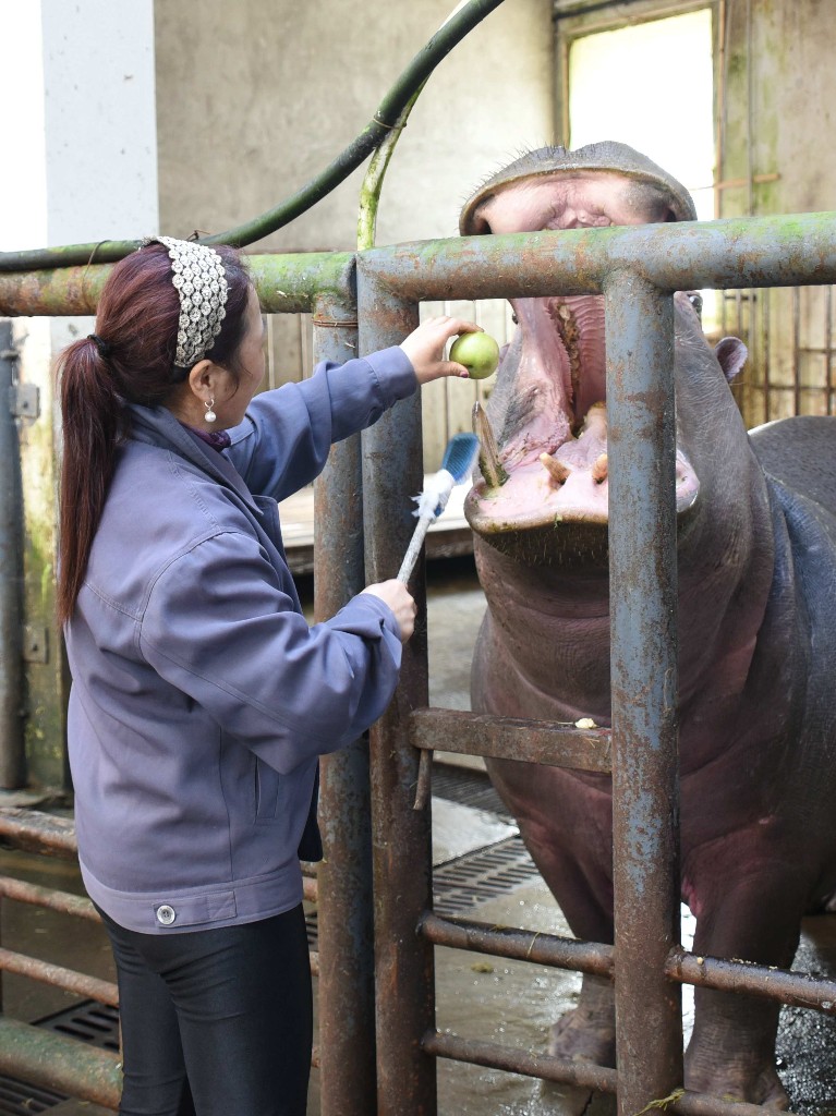 對(duì)于成年河馬除了身高體重測(cè)量,還要多加一項(xiàng)口腔檢查??纯茨菑堦懮溉閯?dòng)物中最大的嘴里,口腔、牙齒是否健康。為更好觀察細(xì)節(jié)會(huì)先給河馬刷牙,河馬們對(duì)這種健康又舒適的特殊服務(wù)十分歡迎。