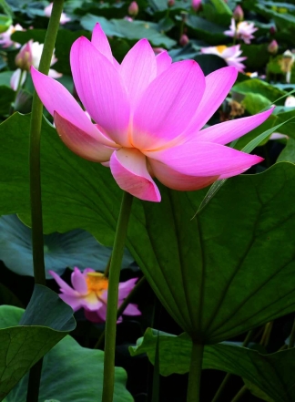 荷花凋謝前,花中心蕊開始長(zhǎng)蓮蓬。秋天花瓣脫落,便留下蓮蓬,形狀似漏斗。蓬內(nèi)長(zhǎng)著蓮子,成熟后顆顆飽滿凸起。荷梗是一枝中空管狀長(zhǎng)梗,其外表生毛刺。荷花、荷蓋、蓮蓬都長(zhǎng)在梗的頂端,夏天干挺,秋后干扁,并會(huì)曲折而斷。尖葉是葉蓋的初長(zhǎng)之葉,兩頭尖,卷曲成筒形,梗短而細(xì)小,很優(yōu)美。