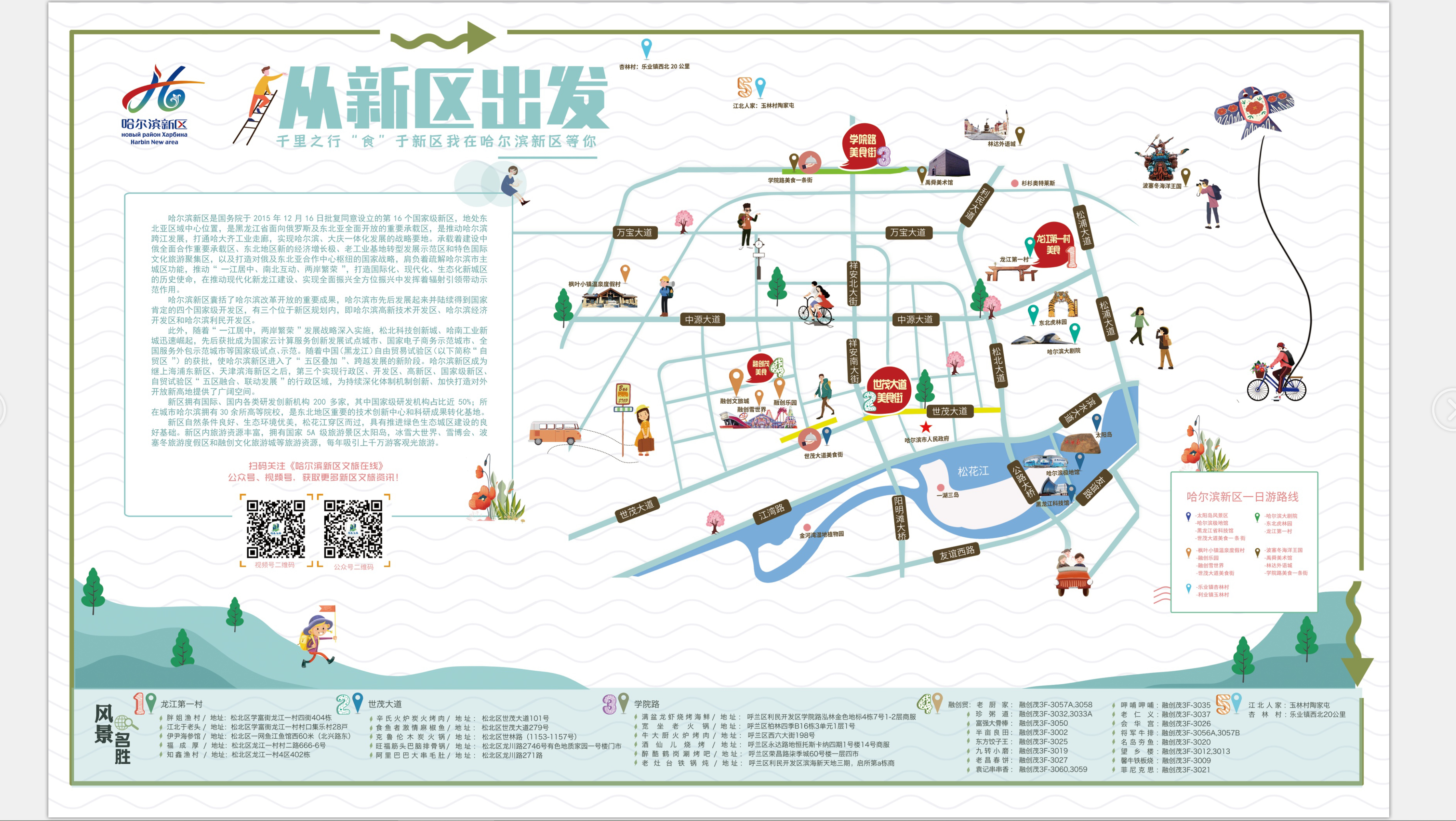 《哈爾濱新區(qū)美食地圖》以新區(qū)特色美食為主題,突出“美食+旅游”的特色結(jié)合,旨在為游客推薦新區(qū)多種多樣的優(yōu)質(zhì)美景美食,在豐富游客度假體驗(yàn)的同時(shí),叫響本土美食品牌,并推出五條“美食+”旅游度假一日游路線。通過(guò)《哈爾濱新區(qū)美食地圖》,市民和游客可以一站式了解新區(qū)的“吃住游娛購(gòu)”。