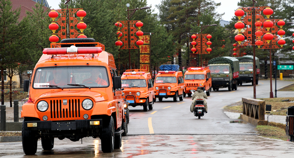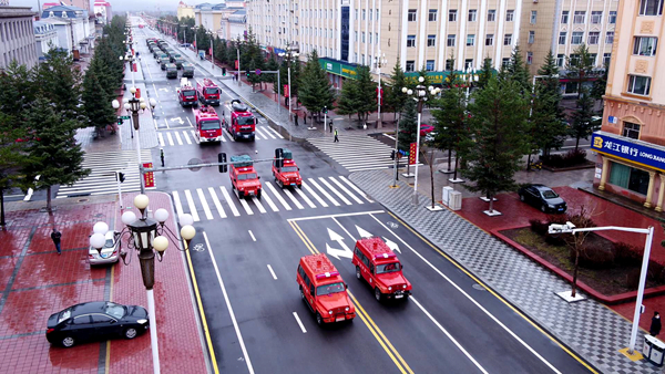 在漠河市城區(qū)主要街道,由防火指揮車、防火宣傳車、防火運兵車等33臺車輛組成的反思巡游車隊,長鳴防火警報,繞市區(qū)緩慢行駛,通過聲勢浩大的宣傳,警醒廣大居民群眾以史為鑒,深刻反思“五?六”火災(zāi)帶來的慘痛教訓(xùn),讓森林防火時刻深入人心,嚴防森林火災(zāi)發(fā)生。在漠河市區(qū)開展巡游活動的同時,各鎮(zhèn)也同步組織開展了規(guī)模不同的“五·六”反思警示教育活動。