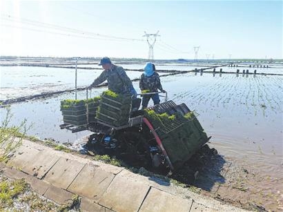 坤站村稻豐糧食種植農(nóng)民專業(yè)合作社理事長楊軍介紹,受氣溫影響,今年插秧比往年延遲一周左右,為了把時間搶回來,合作社社員起早貪黑,從早晨四點多就開始插秧。合作社今年種植水稻面積3000多畝,為抗低溫、保全苗、奪高產(chǎn),全部采用機械化插秧,一臺插秧機每天可插秧50畝。楊軍說,去年建設(shè)的水稻公園成為游客網(wǎng)紅打卡地,今年在稻田公園新設(shè)計一個慶祝建黨100周年和鄉(xiāng)村振興的彩繪圖案,助力鄉(xiāng)村旅游業(yè)發(fā)展。