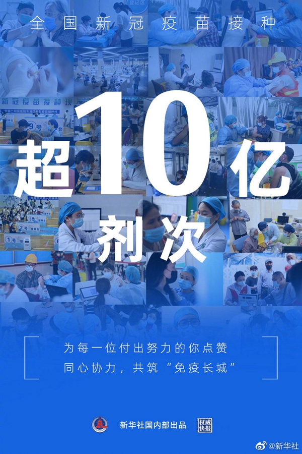 國家衛(wèi)健委6月20日通報(bào),全國新冠疫苗接種超10億劑次,這個(gè)數(shù)字來之不易。這場大規(guī)模接種工作,離不開全國人民的共同努力,預(yù)計(jì)年底前至少70%目標(biāo)人群接種疫苗。疫情形勢(shì)仍然嚴(yán)峻,你我同心協(xié)力,共筑“免疫長城”。(記者陳席元 徐鵬航 海報(bào)設(shè)計(jì) 張晨光)