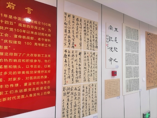 據(jù)了解,此次活動共入展攝影作品41幅、書法作品15幅、繪畫作品13幅、手工制作5件、詩歌2首及微視頻4部,其中部分作品在該院門診五樓進(jìn)行了展示。攝影作品《守護(hù)》,作者是省醫(yī)院兒科副主任汪琪,通過鏡頭展現(xiàn)了醫(yī)務(wù)工作者的日常忙碌,及不知疲倦、一絲不茍的內(nèi)心世界;書法作品《紅船精神》,作者是省醫(yī)院南崗院區(qū)泌尿外一科主任楚寧,筆法嫻熟、清秀雋永,字里行間體現(xiàn)出堅(jiān)定理想、百折不撓的奮斗精神;書法作品《不忘初心》聯(lián)句,作者是省醫(yī)院南崗院區(qū)普外科姜峰奇,古樸自然,一顆紅心永向黨;繪畫作品《一唱雄雞天下白》,作者是省醫(yī)院退休老干部張克起,作品直接用畫面抒發(fā)革命浪漫主義情懷;繪畫作品《江山多嬌》,作者是省醫(yī)院退休老職工賈雨虹,用嬌美的花朵為黨的百年華誕獻(xiàn)禮。