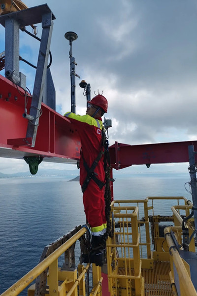 北斗導(dǎo)航設(shè)備除了在中央控制室安裝的北斗 /GNSS 海洋參考位置終端,還需要在鉆井平臺(tái)頂部安裝信號(hào)接收等設(shè)備。天線布設(shè)的位置、方向、高度等因素都會(huì)影響定位系統(tǒng)的精度,為了實(shí)現(xiàn)系統(tǒng)的標(biāo)準(zhǔn)化安裝,團(tuán)隊(duì)成員“親自上陣”選點(diǎn)、布設(shè)、安裝。在接受安全操作相關(guān)培訓(xùn)后,近 20 人次攜帶安全設(shè)備攀爬高度 137 米的平臺(tái)井架,進(jìn)行天線安裝及線纜布設(shè)。