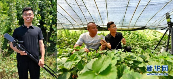 拼版照片:左圖為張成蘊(yùn)在山西省運(yùn)城市絳縣臨澮村的田間;右圖為張成蘊(yùn)(右)在大棚里錄制農(nóng)業(yè)科普視頻(7月14日攝)。今年34歲的張成蘊(yùn)大學(xué)畢業(yè)后,一直熱衷于用拍攝視頻的方式宣傳家鄉(xiāng)的風(fēng)土人情。2018年8月,他開始在社交平臺上幫助鄉(xiāng)親們直播帶貨,真誠的笑容、優(yōu)質(zhì)的產(chǎn)品和專業(yè)的知識是他吸引粉絲的“訣竅”。