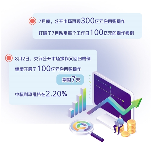 7月底,公開市場再現(xiàn)300億元逆回購操作,打破了7月以來每個工作日100億元的操作慣例。7月29日、30日,中國人民銀行連續(xù)發(fā)公告稱,為維護月末流動性平穩(wěn),以利率招標方式開展了300億元逆回購操作,期限7天,中標利率維持在2.20%不變。
