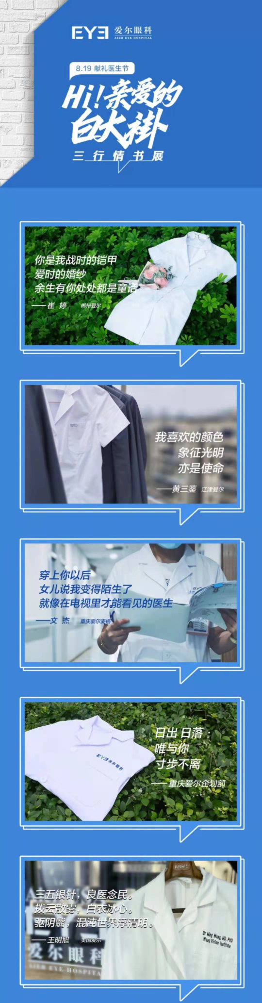 除了溫情脈脈、感動(dòng)滿滿的系列微電影,愛(ài)爾眼科還啟動(dòng)了醫(yī)師節(jié)“三行情書”征集活動(dòng)。溫柔細(xì)致、多才多藝的醫(yī)生們,用他們或細(xì)膩、或豪放的筆觸,寫下了自己對(duì)“白大褂”真摯的情感?;顒?dòng)開展以來(lái),共收到海內(nèi)外情書作品近2000件,最終此次活動(dòng)共評(píng)選出“最美情書”、“最佳告白”共100個(gè)優(yōu)秀作品。(愛(ài)爾眼科)