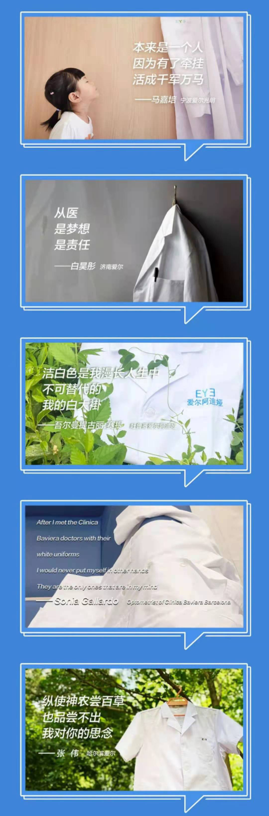 自2018年設(shè)立“醫(yī)師節(jié)”以來(lái),醫(yī)師節(jié)已走過(guò)四個(gè)春秋冬夏。為感激白衣天使的辛勤付出,為致敬醫(yī)生家屬的默默支持,愛(ài)爾眼科特策劃《Hi,親愛(ài)的白大褂》系列活動(dòng)。在微電影展出中,用三個(gè)視頻,三個(gè)視角,展示那些不為人知的醫(yī)患故事,記錄那些點(diǎn)點(diǎn)滴滴的感動(dòng)與溫情。