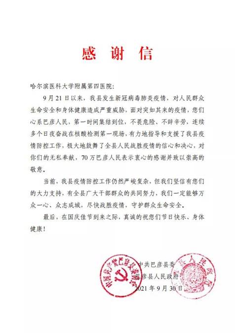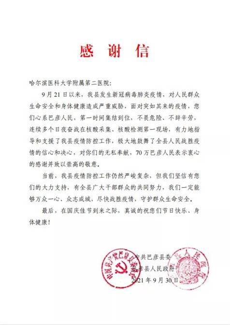 黑龍江經(jīng)濟(jì)網(wǎng)訊(黑龍江日報(bào)全媒體見習(xí)記者董廣碩 商祺)近日,哈爾濱醫(yī)科大學(xué)附屬一院、二院、腫瘤醫(yī)院、四院分別收到巴彥縣委縣政府的感謝信,感謝他們“有力地指導(dǎo)和支援了我縣疫情防控工作,極大地鼓舞了全縣人民戰(zhàn)勝疫情的信心和決心?!?/span>