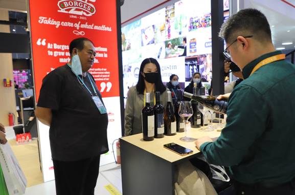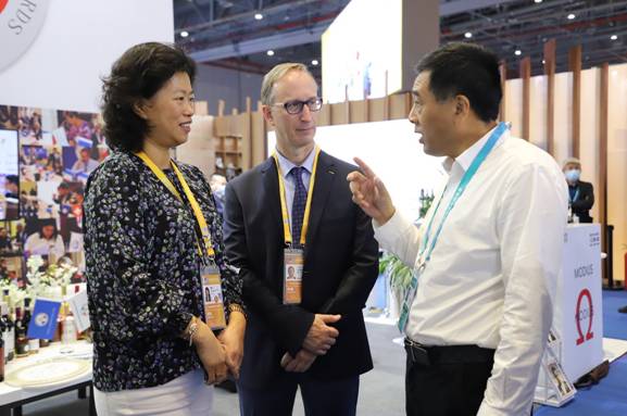 圖為大興安嶺林業(yè)集團(tuán)公司黨委副書(shū)記、總經(jīng)理李軍(左二)向法國(guó)參展企業(yè)推介北極冰藍(lán)莓酒莊紅酒系列產(chǎn)品(王力/攝)