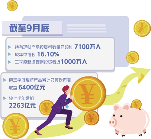 而且,隨著居民財(cái)富的不斷積累,投資者的理財(cái)意識顯著增強(qiáng),銀行理財(cái)投資者人數(shù)持續(xù)增長,截至9月底,持有理財(cái)產(chǎn)品投資者數(shù)量已超過7100萬人,較年中增長16.10%,僅三季度新增理財(cái)投資者近1000萬人。在轉(zhuǎn)型過程中,理財(cái)產(chǎn)品的投資收益也穩(wěn)中有升,前三季度理財(cái)產(chǎn)品累計(jì)兌付投資者收益6400億元,較上半年增加2263億元。
