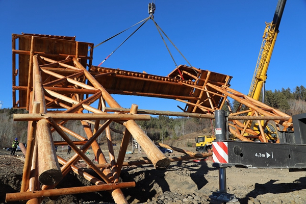 早上10點58分,只見平靜的林業(yè)局薩布素軍馬場頓時熱鬧了起來,兩臺大型起重機發(fā)動機嗡嗡作響,一東一西緩慢吊起10多噸重的大門,因偏向一側(cè)首次作業(yè)沒有成功。安裝技術(shù)人員調(diào)整重心點,第二次試舉,并在一臺裝載機的協(xié)助下,調(diào)整機位,歷時2個多小時,才將具有濃郁驛站文化風(fēng)格的高10米、寬14米的木質(zhì)大門,矗立在平地上。