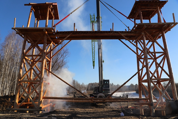 阿木爾林業(yè)局薩布素景區(qū)的薩布素軍馬場大門被緩緩起吊起來(王力/攝)