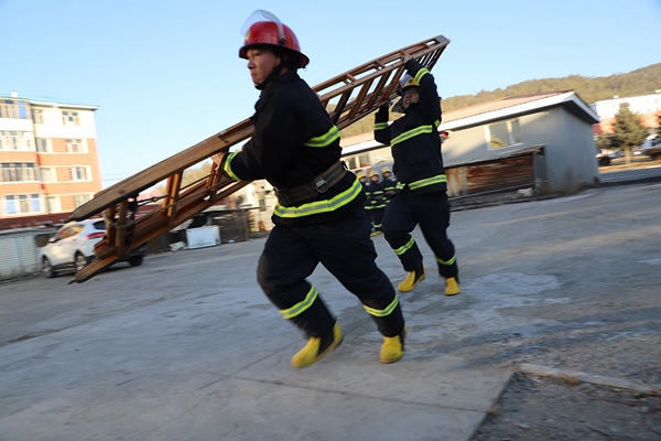 阿木爾公安城鎮(zhèn)消防大隊戰(zhàn)斗員演練二節(jié)拉梯科目(王力/攝)