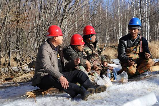 阿木爾林業(yè)局多種經(jīng)營公司干部職工在修復(fù)水毀橋時(shí)利用歇息時(shí)間研究下步工作(王力 攝)