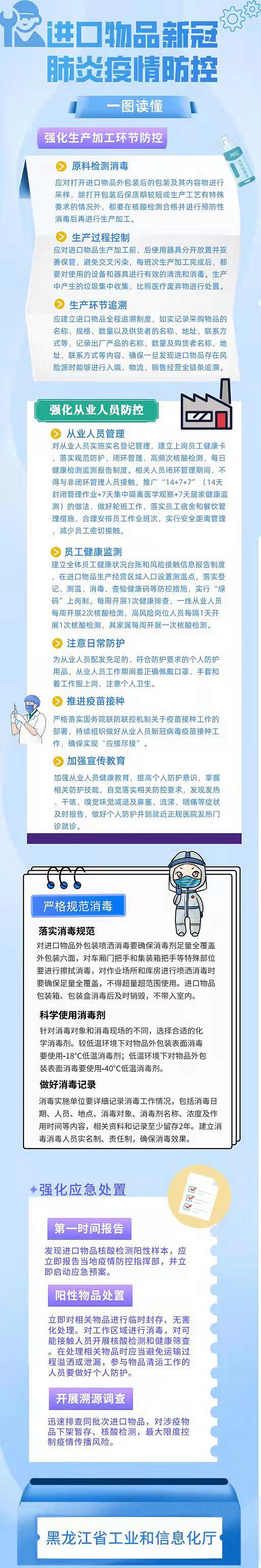 公開信表示,近期疫情反彈形勢嚴(yán)峻復(fù)雜,為確保工業(yè)企業(yè)不發(fā)生聚集性疫情,共同構(gòu)筑疫情防控堅固防線,提示:涉及進(jìn)口物品加工、使用的工業(yè)企業(yè)要嚴(yán)格按照《黑龍江省進(jìn)口物品新冠肺炎疫情風(fēng)險防控工作方案》落實(shí)各項防疫措施。一要強(qiáng)化生產(chǎn)加工環(huán)節(jié)的防控。生產(chǎn)前做好原料檢測消毒,生產(chǎn)中做好過程控制,設(shè)備和器具進(jìn)行有效的清洗和消毒避免交叉污染,產(chǎn)生的垃圾集中收集,比照醫(yī)療廢棄物進(jìn)行處置。建立進(jìn)口物品全程追溯制度,確保一旦發(fā)現(xiàn)進(jìn)口物品存在風(fēng)險源時能夠進(jìn)行入境、物流、銷售經(jīng)營全鏈條追溯。二要強(qiáng)化從業(yè)人員防控。對員工實(shí)施實(shí)名登記管理,做好員工健康監(jiān)測和核酸檢測,合理安排作業(yè)班次,減少密切接觸。配發(fā)充足并符合防護(hù)要求的個人防護(hù)用品,加強(qiáng)員工健康教育,提高個人防護(hù)意識。嚴(yán)格落實(shí)當(dāng)?shù)仃P(guān)于疫苗接種工作的部署,持續(xù)組織做好員工新冠病毒疫苗接種工作,確保實(shí)現(xiàn)“應(yīng)接盡接”。三要嚴(yán)格規(guī)范消毒。對進(jìn)口物品外包裝、加工場所、車廂門把手和集裝箱把手等要嚴(yán)格按照規(guī)范消毒,消毒時要確保足量全覆蓋并針對消毒對象和消毒現(xiàn)場的不同選擇合適的化學(xué)消毒劑。詳細(xì)記錄消毒工作情況,建立消毒人員實(shí)名制、責(zé)任制,確保消毒效果。四要強(qiáng)化應(yīng)急處置。發(fā)現(xiàn)進(jìn)口物品核酸監(jiān)測陽性樣本,應(yīng)立即報告當(dāng)?shù)匾咔榉揽刂笓]部,并同步啟動應(yīng)急預(yù)案。對相關(guān)物品進(jìn)行臨時封存、無害化處理,對工作區(qū)域進(jìn)行消毒,對可能接觸的人員開展核酸檢測和健康篩查。迅速排查同批次進(jìn)口物品,最大限度控制疫情傳播風(fēng)險。