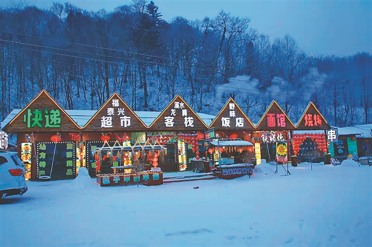 當(dāng)我們抵達雪谷的時候,暮色已濃,天地間覆蓋了一片黑色的幕布。但雪谷中心街道上,聳立著由上千只大紅燈籠排列組合的拱形門,燈火輝煌,延續(xù)百米開外。門的頂端中央鑲嵌著“中國雪谷”四個金色大字,格外醒目。我們停下車拍照,并就近住宿,溫暖的火炕讓我們很快進入夢鄉(xiāng)。