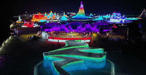 在30分鐘的暖場(chǎng)表演中,黑龍江哈爾濱、新疆阿勒泰、江蘇南京、廣東深圳等地舉行了慶?;顒?dòng),并以連線的方式與暖場(chǎng)演出進(jìn)行互動(dòng)。其中,哈爾濱的互動(dòng)表演節(jié)目現(xiàn)場(chǎng),選在了被譽(yù)為“黑龍江冰雪旅游名片”的哈爾濱冰雪大世界。