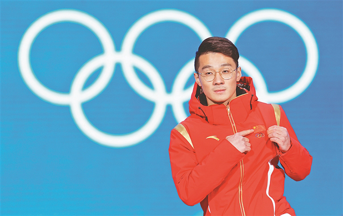 2月8日,冠軍中國隊選手任子威出席獎牌頒發(fā)儀式。當(dāng)日,北京2022年冬奧會短道速滑男子1000米獎牌頒發(fā)儀式在北京賽區(qū)頒獎廣場舉行。新華社發(fā)