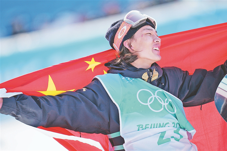 2月15日,中國(guó)選手蘇翊鳴在奪冠后慶祝。 當(dāng)日,北京2022年冬奧會(huì)單板滑雪男子大跳臺(tái)決賽在北京首鋼滑雪大跳臺(tái)舉行。中國(guó)選手蘇翊鳴奪得金牌。 新華社記者 李一博攝