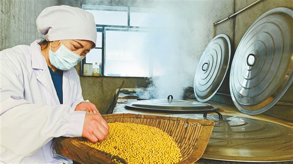 漫長的歲月,手藝人不斷積累經(jīng)驗,對豆子在發(fā)酵過程中不斷變化的溫度、色澤、香氣等有了直覺判斷,才讓胡曉華的手工大醬保存了讓人認(rèn)可的老味道。經(jīng)常有人慕名找她咨詢,“我家大醬為啥不發(fā)酵?”“大醬酸了咋辦?”……她都一一耐心地解答。