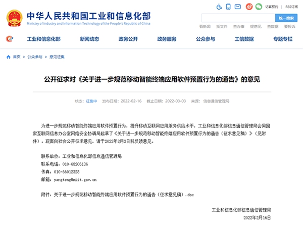 據(jù)工信部網(wǎng)站16日消息,工信部公開征求對《關于進一步規(guī)范移動智能終端應用軟件預置行為的通告》的意見?!锻ǜ妗诽岢?,生產(chǎn)企業(yè)應確保除基本功能軟件外的預置應用軟件均可卸載,并提供安全便捷的卸載方式供用戶選擇。全文如下: