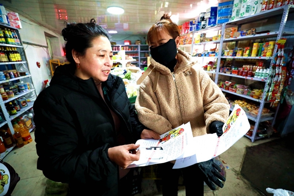 阿木爾社區(qū)志愿者王春草(左一)、李建靜(右一)深入到何忠智經營業(yè)戶,宣傳《森林法》,增強居民法律意識(王力 攝)