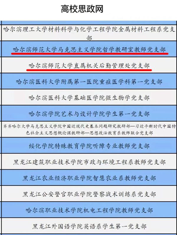 黑龍江經(jīng)濟網(wǎng)訊(黑龍江日報全媒體見習記者董廣碩 商祺)根據(jù)《教育部辦公廳關(guān)于開展第三批新時代高校黨建示范創(chuàng)建和質(zhì)量創(chuàng)優(yōu)工作的通知》要求,經(jīng)哈爾濱師范大學校黨委組織申報、省級黨委教育工作部門推薦、資格審查、專家評審、教育部黨的建設(shè)和全面從嚴治黨工作領(lǐng)導小組成員單位集中審議、結(jié)果公示,遴選產(chǎn)生了全國黨建工作示范高校、標桿院系和樣板支部。哈爾濱師范大學馬克思主義學院哲學教研室教師黨支部和直屬機關(guān)后勤管理處黨支部獲批“全國黨建工作樣板支部”。到目前為止,哈爾濱師范大學共獲批1個全國黨建工作標桿院系,4個全國黨建工作樣板支部,1個全國研究生樣板黨支部,獲批數(shù)量居于省屬高校首位。