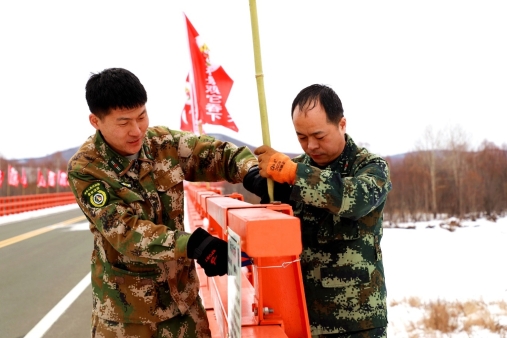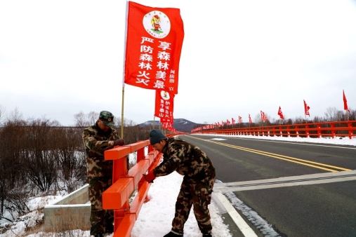 紅旗林場(chǎng)職工在京漠公路2410公里處的阿木爾河大橋安裝防火宣傳彩旗(王力 攝)