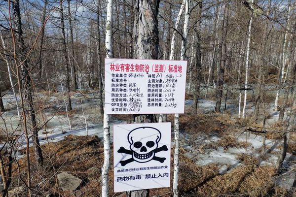 新林林業(yè)局塔源林場營林病防人員在鼠害多發(fā)區(qū)設(shè)立警示牌,用于提醒居民(劉松 攝)