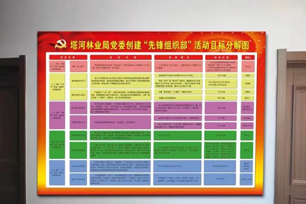 掛圖“作戰(zhàn)”,統(tǒng)籌指導。塔河林業(yè)局黨委組織部結(jié)合自身實際制定了《塔河林業(yè)局黨委創(chuàng)建“先鋒組織部”實施方案》;緊緊圍繞集團黨委下發(fā)方案中的“五大”活動和九項具體工作內(nèi)容制定目標分解展示圖,詳細列出了活動內(nèi)容、活動要求、完成時限,秉承誰具體負責,誰統(tǒng)籌推進,誰跟蹤問效的的原則,將責任落實到人頭,時刻督促每名組工干部及時完成目標任務(wù),凝心聚力,共同打造講政治、重公道、業(yè)務(wù)精、作風好的組工干部隊伍。