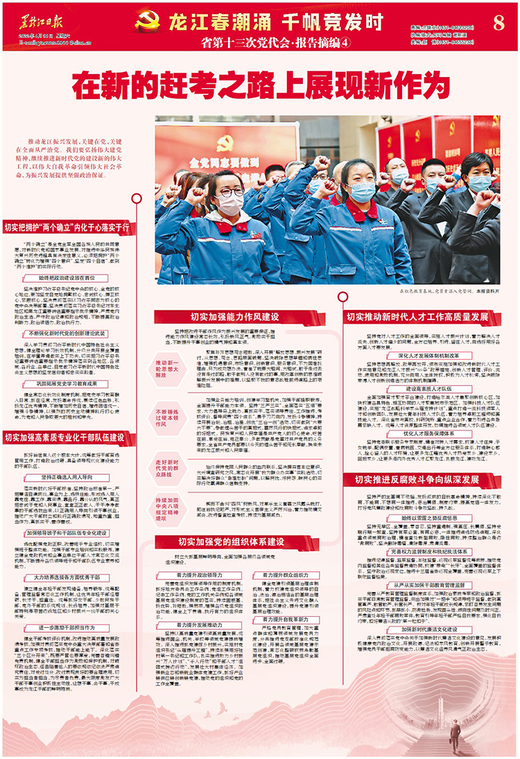 推動(dòng)龍江振興發(fā)展,關(guān)鍵在黨,關(guān)鍵在全面從嚴(yán)治黨。我們要弘揚(yáng)偉大建黨精神,繼續(xù)推進(jìn)新時(shí)代黨的建設(shè)新的偉大工程,以偉大自我革命引領(lǐng)偉大社會(huì)革命,為振興發(fā)展提供堅(jiān)強(qiáng)政治保證。