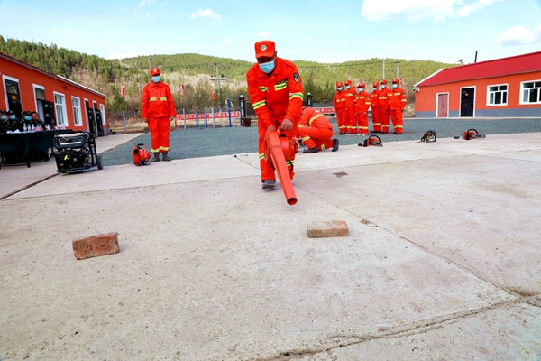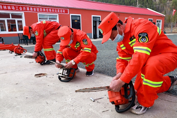 阿木爾林業(yè)局綠林林場專業(yè)撲火隊(duì)員在進(jìn)行風(fēng)力滅火機(jī)、油鋸的拆裝維修使用比賽(王力 攝)