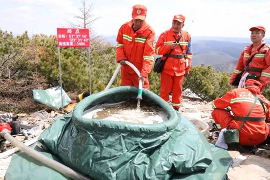 據(jù)了解,此次演練模擬小白山最高峰海拔1404米的“興安第一塔”附近偃松林發(fā)生火情,在海拔886米尋找到一處水源地,撲火隊(duì)員利用高揚(yáng)程山地引水泵向1150米處放置的儲水囊供水,同時架設(shè)第二臺水泵向山頂供水,兩臺水泵交叉接力成功將水引向小白山最高峰,噴淋“興安第一塔”,整個過程鋪設(shè)水帶全長3740延長米,垂直爬高519米。