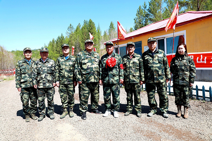 阿木爾林業(yè)局、依東林場領導干部與即將退休的共產黨員、管護員滿德江合影。(王力 攝)