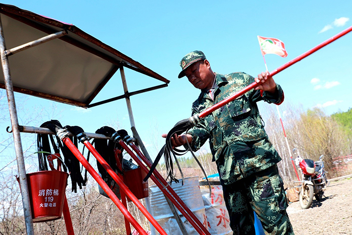 共產黨員、管護員滿德江帶著依依不舍,再次整理、擺放撲火工具。(王力 攝)