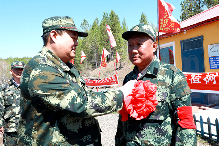 阿木爾林業(yè)局黨委書記胡守慶(左)為依東林場即將退休的共產黨員、管護員滿德江(右)戴上“光榮花”。(王力 攝)