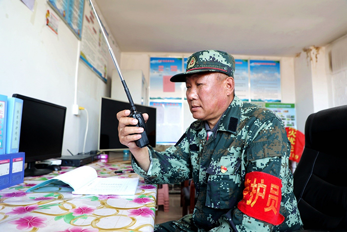 共產黨員、管護員滿德江在向阿防指匯報工作情況。(王力 攝)