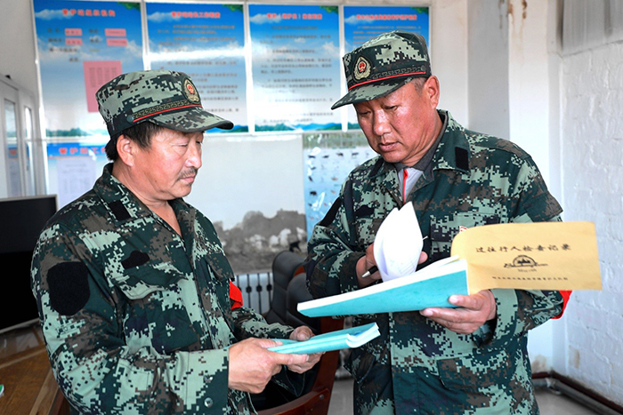 共產黨員、管護員滿德江叮囑“戰(zhàn)友”張振東把記錄本記好。(王力 攝)
