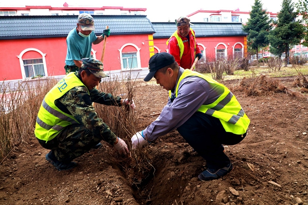 阿木爾林業(yè)局環(huán)衛(wèi)工在種植丁香灌木(王力 攝)