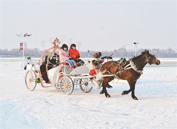 游客在松花江冰雪嘉年華景區(qū)體驗(yàn)雪地馬車。
