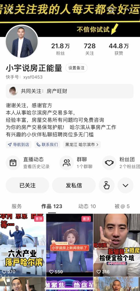 “松北這個(gè)小區(qū),現(xiàn)房7000起步”、“這里是江南核心商業(yè)圈,通勤便利”、“這可以說(shuō)是哈爾濱二環(huán)旁配套設(shè)施最全的樓盤”……晚上8點(diǎn),每當(dāng)夜幕降臨,房產(chǎn)主播小宇(快手ID:xysf0453)會(huì)準(zhǔn)時(shí)出現(xiàn)在快手平臺(tái)直播間,為廣大有購(gòu)房需求的客戶答疑解惑。
