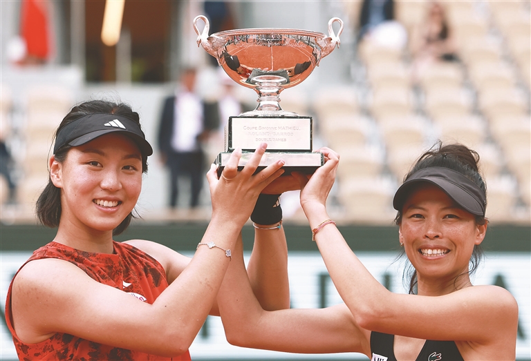 當(dāng)日,在2023法國網(wǎng)球公開賽女子雙打決賽中,王欣瑜(中國)/謝淑薇(中國臺北)以2比1戰(zhàn)勝費爾南德斯(加拿大)/湯森(美國),奪得冠軍。