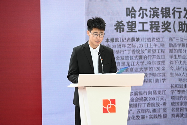 來自哈爾濱理工大學的獲獎學生程同學代表全體獲獎學生向共青團、希望工程、哈爾濱銀行表示感謝,并表達了自己在課業(yè)之余會積極參加“丁香綻放·童心港灣”等志愿服務項目,把公益火種延續(xù)下去。