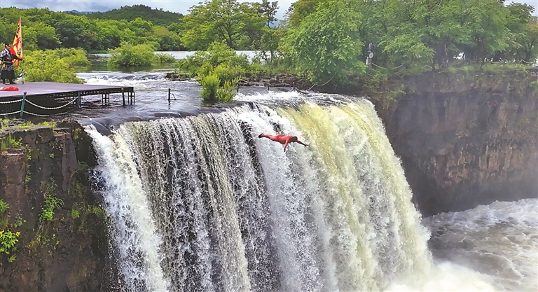 瀑布跳水表演。
