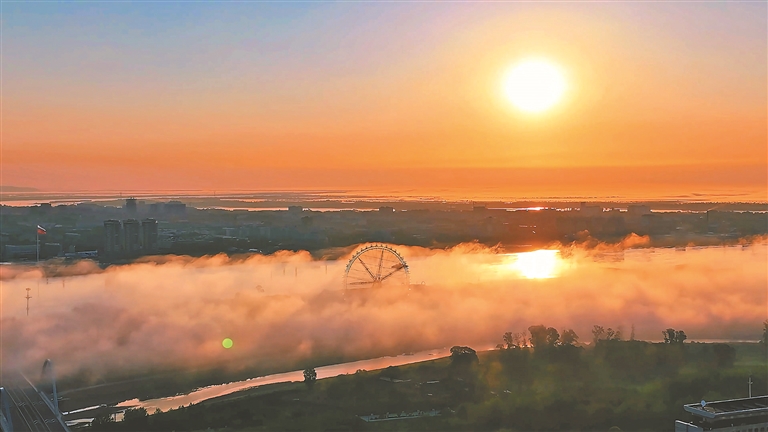 本報(bào)4日訊(關(guān)桐 楊啟坤 記者 潘宏宇)4日清晨,在黑河市愛輝區(qū),中俄界江黑龍江上橙光氤氳,霧氣繚繞,如夢(mèng)似幻,宛若仙境。