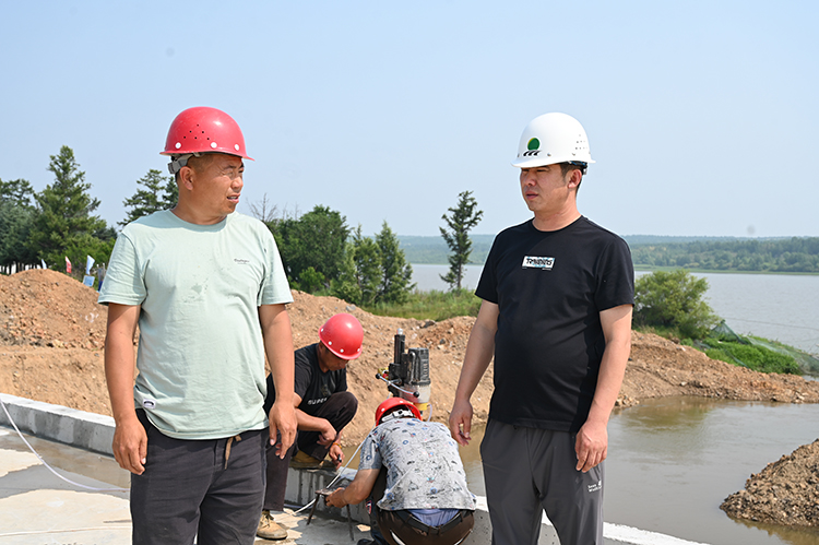 在引龍河農(nóng)場有限公司青年水庫除險加固工程施工現(xiàn)場,機器轟鳴,施工現(xiàn)場對大壩固腳及安全圍欄施工作業(yè),增強壩基防滲能力,消除大壩防洪隱患。同時與施工、設(shè)計部門一同研究,采用增設(shè)防滲膜圍堰措施,加快施工進度,制定了趕工計劃,倒排工期,確保汛限水位以下部分在主汛期來臨前全部完成。此外,現(xiàn)場還有督導(dǎo)組對水庫除險加固工程進行檢查。